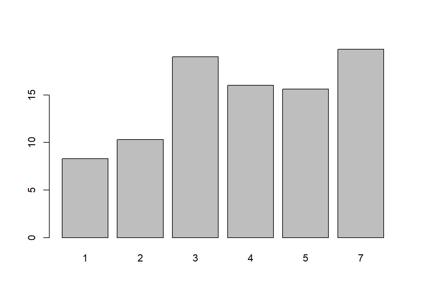 向 barplot() 函数传递两个参数,第一个向量用来设定条形的高度,第二个向量用来设定每个条形对应的标签(可选);如果向量中的元素已被命名,则系统会自动使用元素的名字作为条形标签。