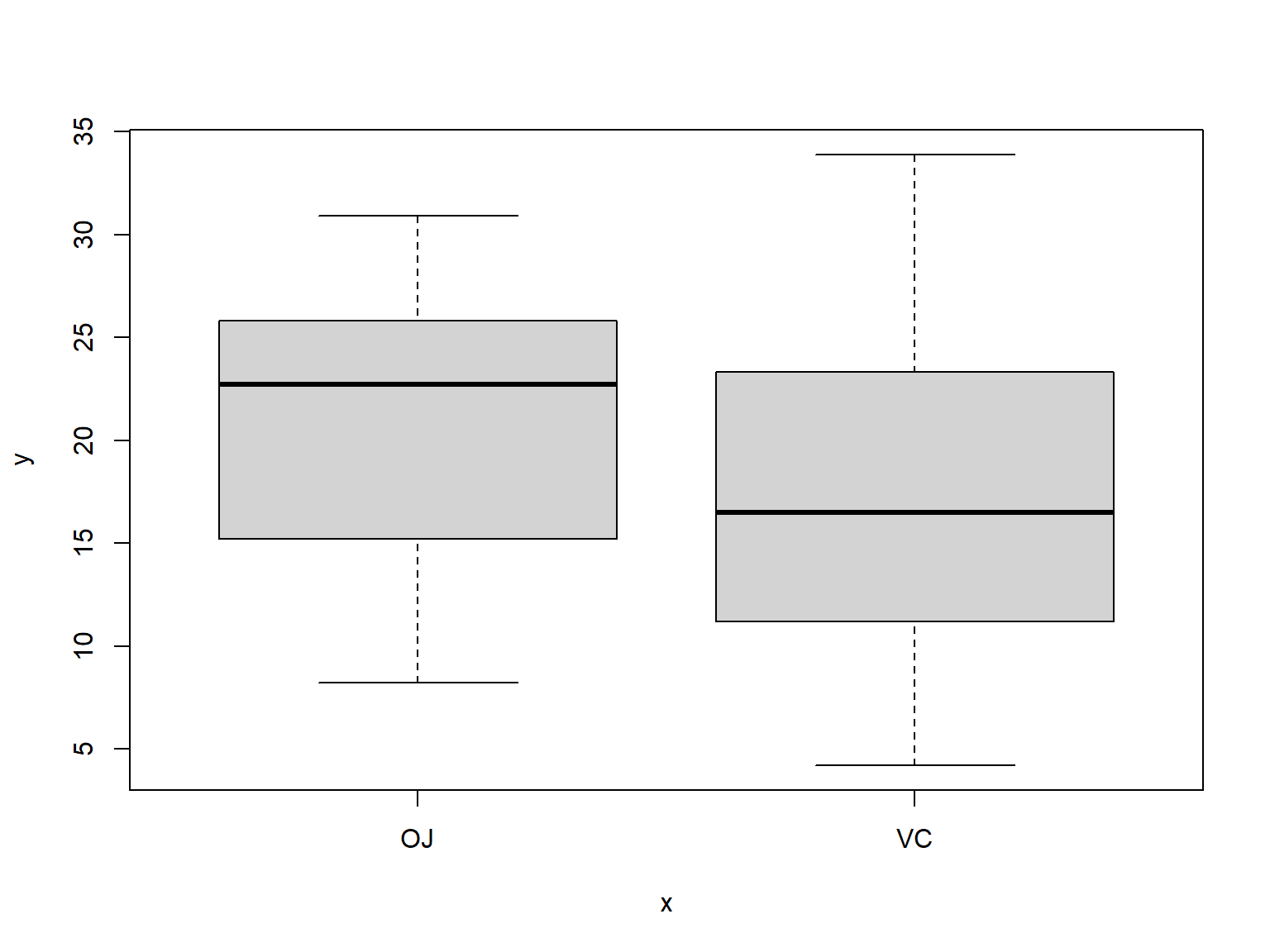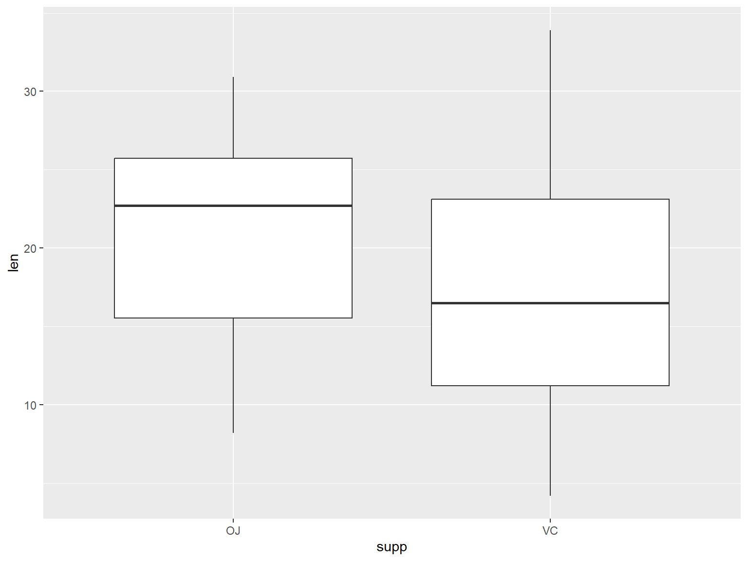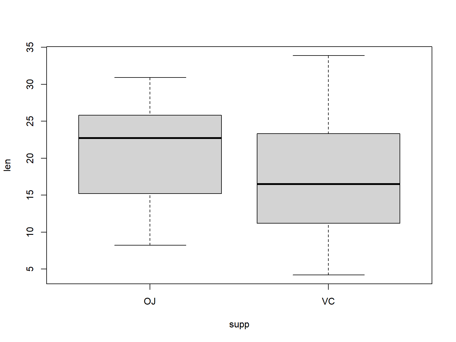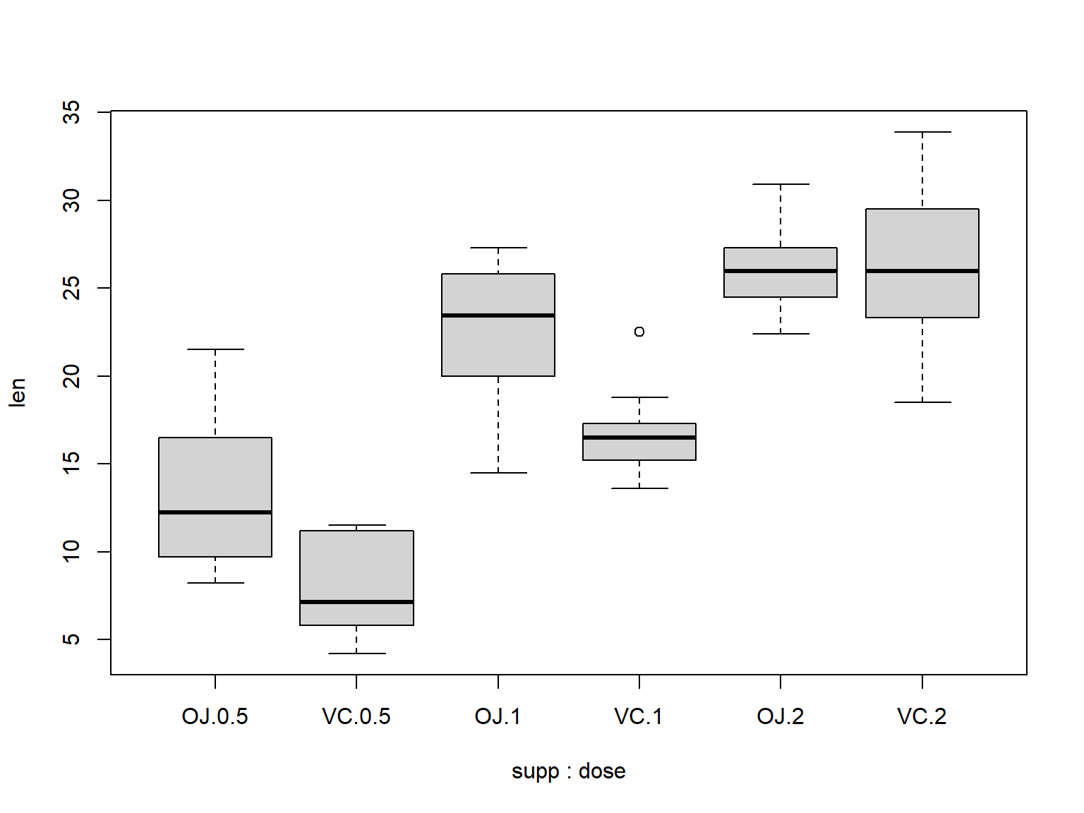 当两个参数向量在同一个数据框时,也可以使用 boxplot() 函数和语法。公式语法允许用户在 x 轴上使用变量组合。
