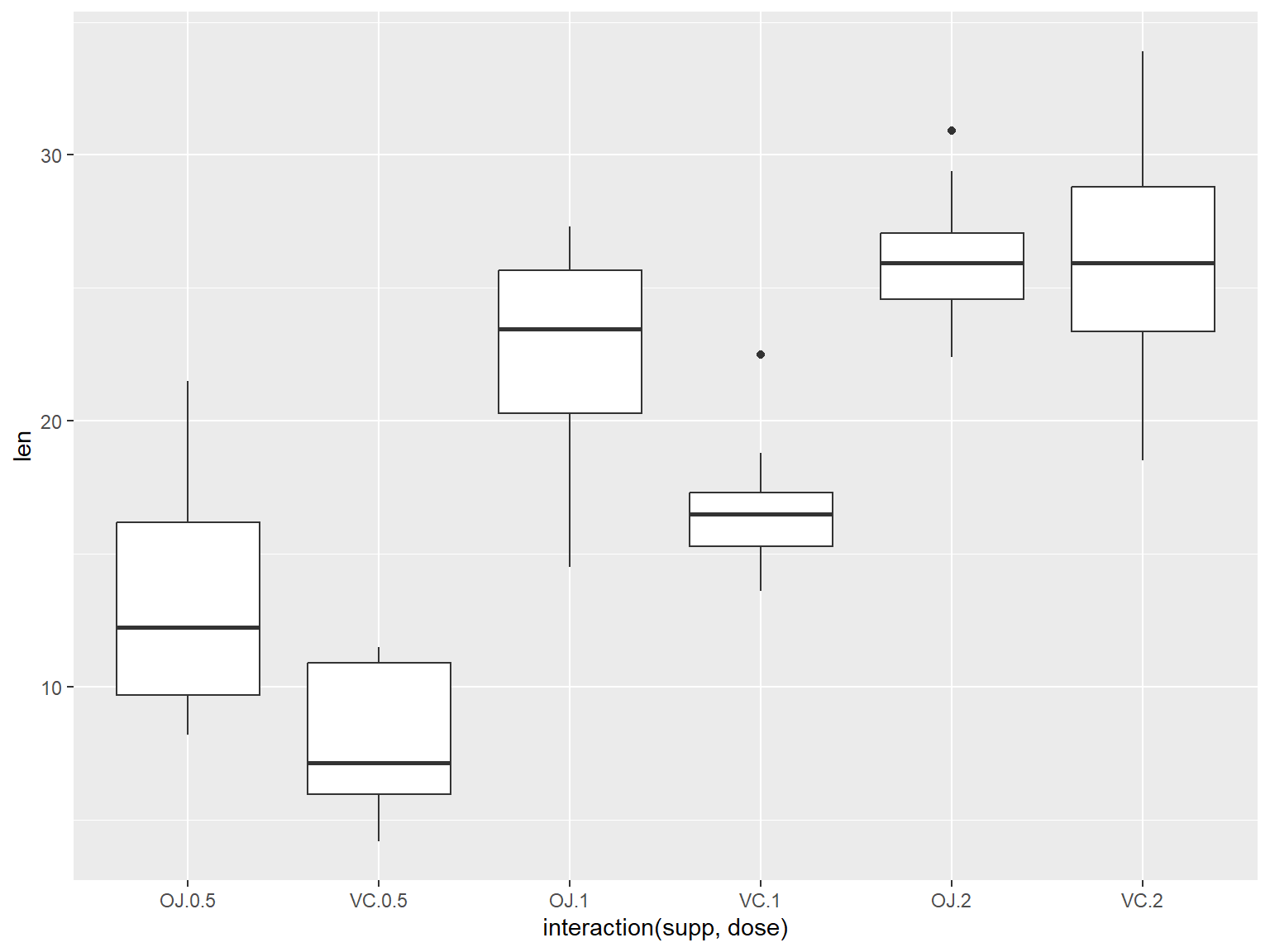 使用 interaction() 函数将分组变量组合在一起来绘制基于多组变量的箱型图。