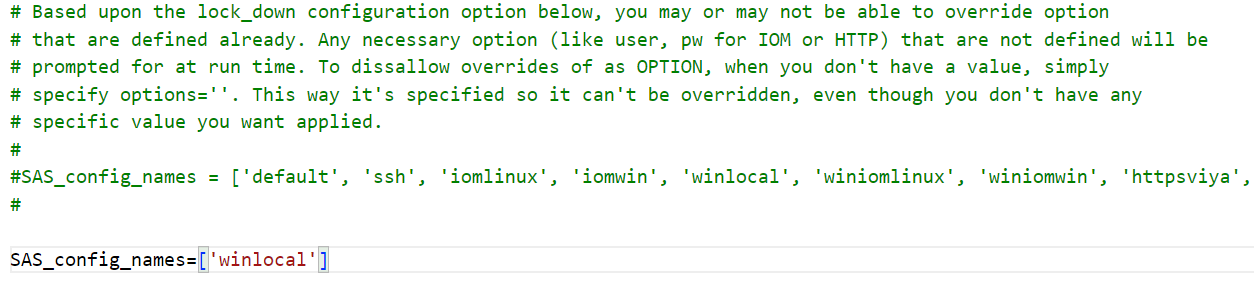 SAS_config_names用于指定连接SAS的配置方式,提供了 10 种方式:default,ssh,iomlinux,iomwin,winlocal,winiomlinux,winiomwin,httpsviya,httpviya,iomcom。默认为default方式。 - 因为我们需要连接Windows机器本地的SAS,所以需要将