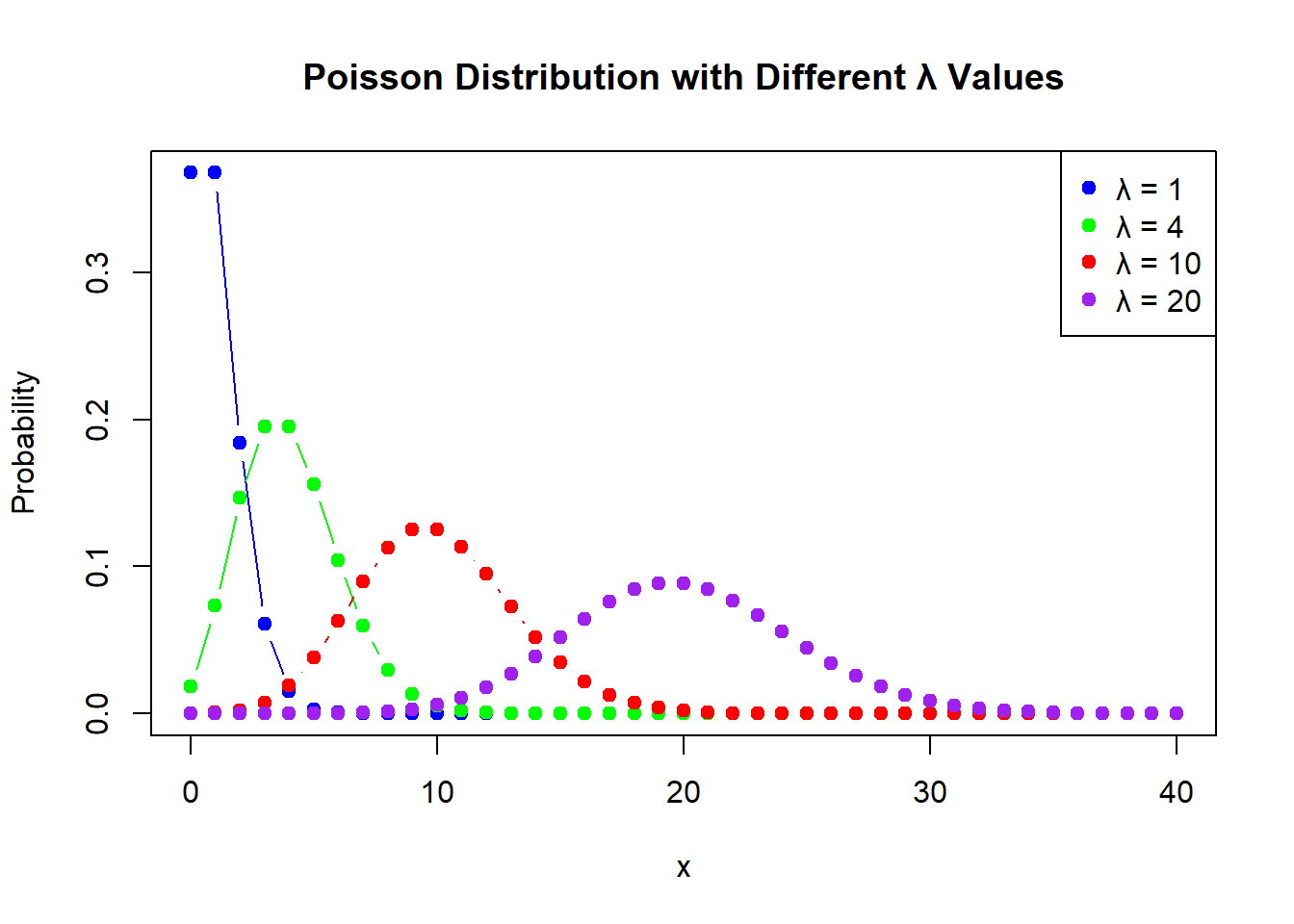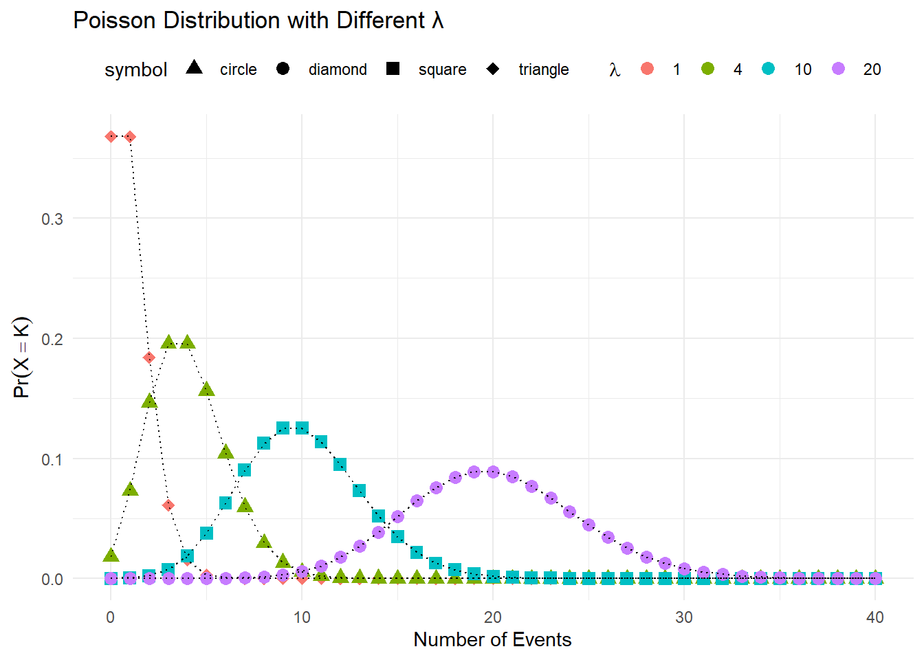 labs(title = "Poisson Distribution with Different λ", x = "Number of Events", y = expression(Pr(X == K))) +