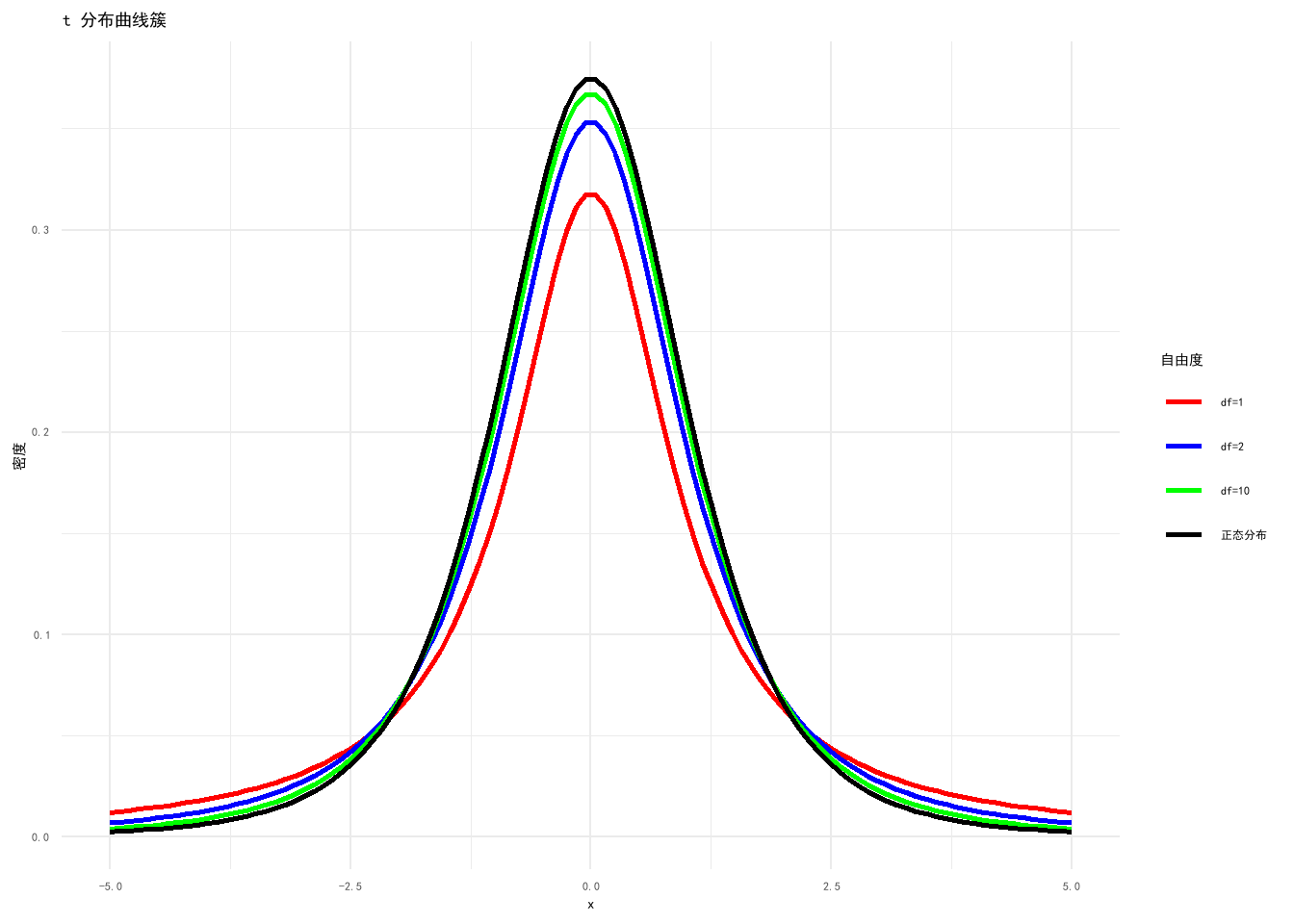 labels = c("df=1", "df=2", "df=10", "正态分布")) +