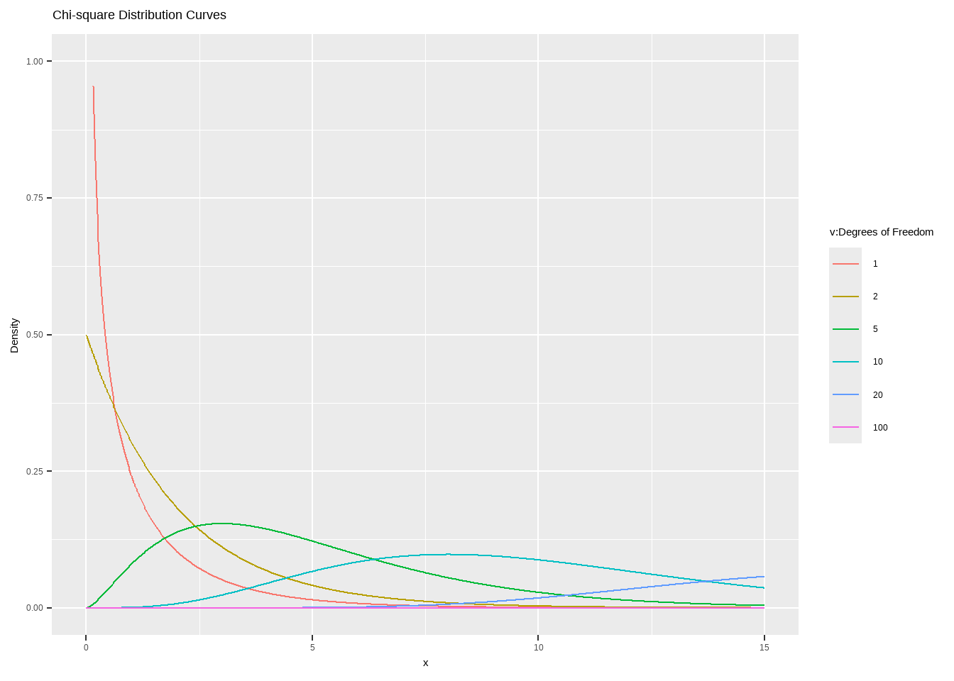 labs(title = "Chi-square Distribution Curves", x = "x", y = "Density", color = "Degrees of Freedom") +