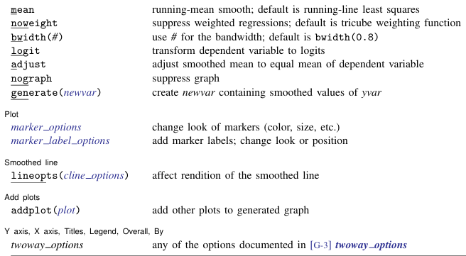 lowess 命令生成的光滑曲线可以通过绘图命令来展示,例如使用 twoway scatter 命令可以在散点图上叠加绘制光滑曲线。lowess — Lowess smoothing